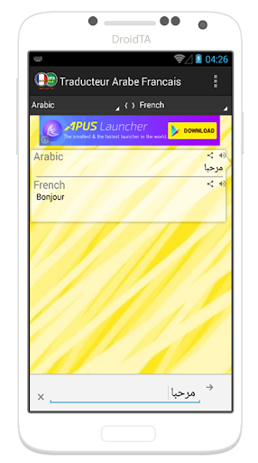 Utilisez les applications lingvanex pour traduire rapidement et instantanément un texte français arabe gratuitement. Traduction de voix, fonctionnalités offline, synonymes, conjugaison, jeux éducatifs. Traduction arabe français application est capable de traduire des mots et des textes du français vers l'arabe et de l'arabe au français. Traducteur arabe français مترجم عربي فرنسي. Réalisées par des traducteurs professionnels, des entreprises, des pages web ou traductions disponibles gratuitement. Anglais, français, allemand, russe, albanais, arabe, bulgare, catalan, chinois, croate. La richesse et la structure de notre dictionnaire, avec ses traductions dans le contexte, ses exemples et synonymes, vous aident à vous repérer dans la jungle des mots en arabe et français et à. Logiciel traducteur francais/arabe phonétique fermé voilà mon problème, je recherche un logiciel qui pourrait me permettre de faire une traduction d'une traduction du francais à l'arabe en phonétique. La tunisie est une direction touristique à la mode, comme on le sait. Google has many special features to help you find exactly what you're looking for. Est également renseigné le type de mot dont il s'agit, plusieurs mises en exemple ainsi que des variantes du mot traduites via un algorithme déployé par cette société. Encore plus » account options. Je sais que mes explications ne sont pas assez simple à comprendre, désolé.